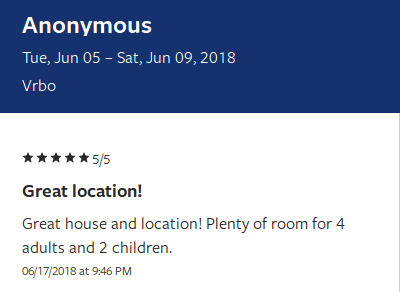 Great location! Posted on November 9, 2020 by usa1731 Tue, Jun 05 – Sat, Jun 09, 2018 (VRBO) Great house and location! Plenty of room for 4 adults and 2 children. Share this: Click to share on WhatsApp (Opens in new window) WhatsApp Click to share on Facebook (Opens in new window) Facebook Click to share on X (Opens in new window) X Like Loading...