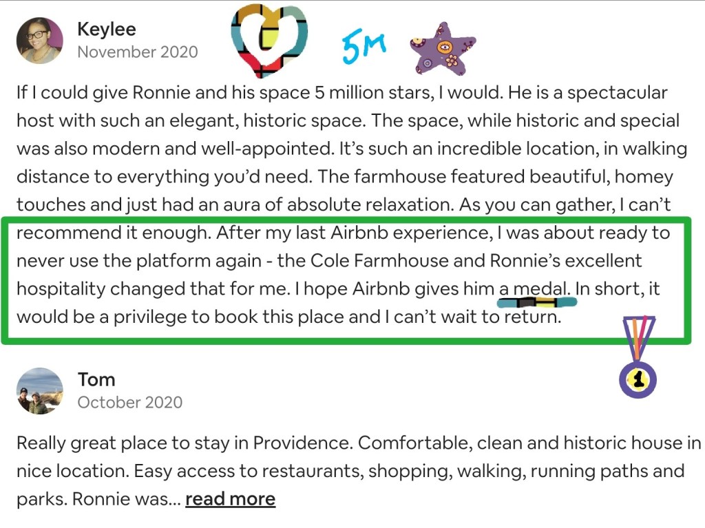 If I could give Ronnie and his space 5 million stars, I would. He is a spectacular host with such an elegant, historic space. The space, while historic and special was also modern and well-appointed. It’s such an incredible location, in walking distance to everything you’d need. The farmhouse featured beautiful, homey touches and just had an aura of absolute relaxation. As you can gather, I can’t recommend it enough. After my last Airbnb experience, I was about ready to never use the platform again – the Cole Farmhouse and Ronnie’s excellent hospitality changed that for me. I hope Airbnb gives him a medal. In short, it would be a privilege to book this place and I can’t wait to return.
