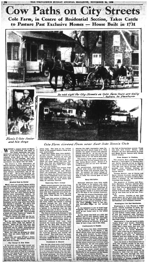 WITHIN a stone’s throw of Blackstone boulevard and some of the finest residences, and best residential property, in the city, Cole’s Farm, an odd relic of the past, with its colonial house built in 1731, is approaching its end – perhaps. For there are many who have been predicting its conversion into house-lots for years.