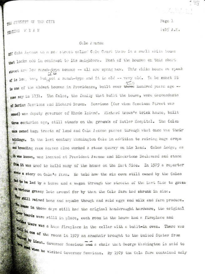 Off Cole Avenue on a near street called Cole Court there is a small white house that looks odd in contrast to its neighbors. Most of the houses on this short street are low ranch-type houses — all are spang new. This white house we speak of is low, too, but it is not a ranch-type and it is old – very old. To be exact it is one of the oldest houses in Providence, built over two hundred years ago – some say in 1731. The Coles, the family that built the house, were descendants of Darius Sessions and Richard Brown. Sessions (for whom Sessions Street was named) was deputy governor of Rhode Island. Richard Brown’s brick house, built three centuries ago, still stands on the grounds of Butler Hospital. The Coles once owned huge tracts of land and Cole Avenue passes through what once was their holdings. In the last century Washington Cole in addition to raising huge crops and breeding racehorses also worked a stone quarry on his land. Coles Ledge, as it was known, was located at President Avenue and Blackstone Boulevard and stone from it was used to build many of the homes on the East Side. In 1929 a reporter wrote a story on Cole’s farm. He told how the six cows still owned by the Coles had to be led by a horse and a wagon through the streets of the East Side to graze is various grassy lots around for by then the Cole farm had shrunk in size. They still raised hens and squabs though and sold eggs and milk and farm produce. The house in those days still had the original handwrought hardware, the original floor boards were still in place, each room in the house had a fireplace and besides there was a huge fireplace in the cellar with a built-in oven. There was still in one of the rooms in 1929 an armchair brought to the United States from byland by Lieut. Governor Sessions — a chair that George Washington is said to have used when he visited Governor Sessions. By 1929 the Cole farm contained only three and a half acres — a far cry from Mr. Washington Cole’s hundreds of acres. And since 1929 the three and a half acres have been sold for real estate, too. All that remains now of a vast farm is one small, old, white farmhouse, with a covered well and a millstone in the yard with a man by the name of Cole still living in it and a whole pageant of historical ghosts parading through its rooms and around its walls. This is the Cole farm, and Cole Avenue and Cole Court –- the streets of the city.