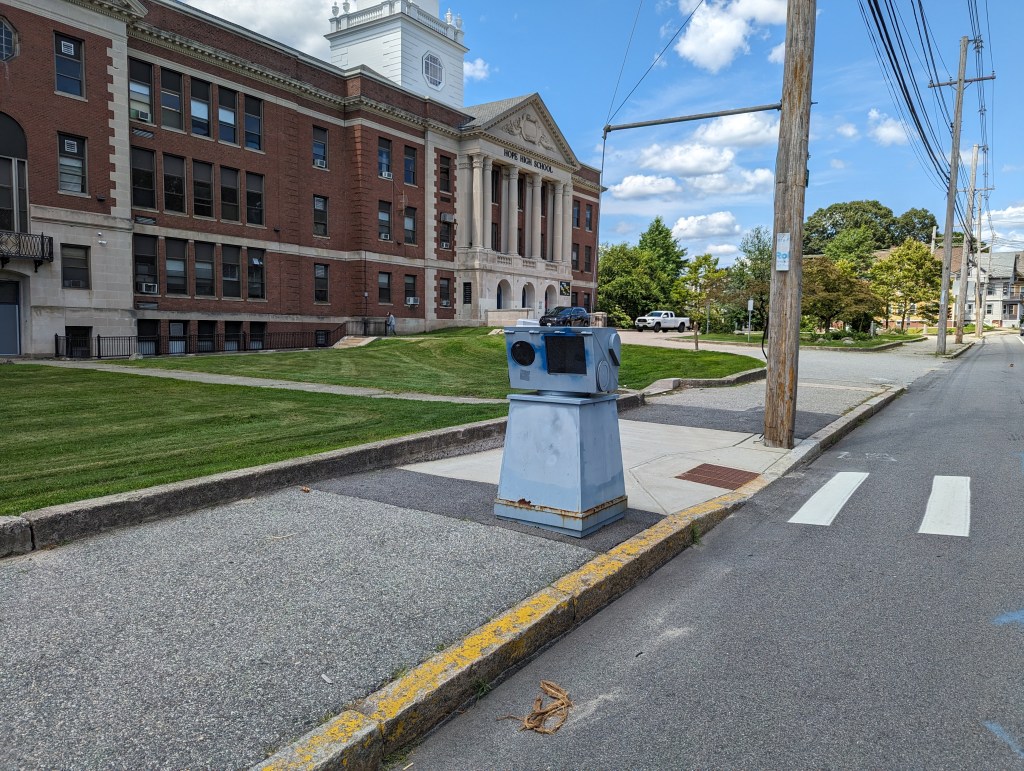 Note: The photo below shows the speed cameras in Providence — it’s big, ugly and sits on the sidewalk . Other cities nearby (e.g. Pawtucket, East Providence) have cameras that look different.