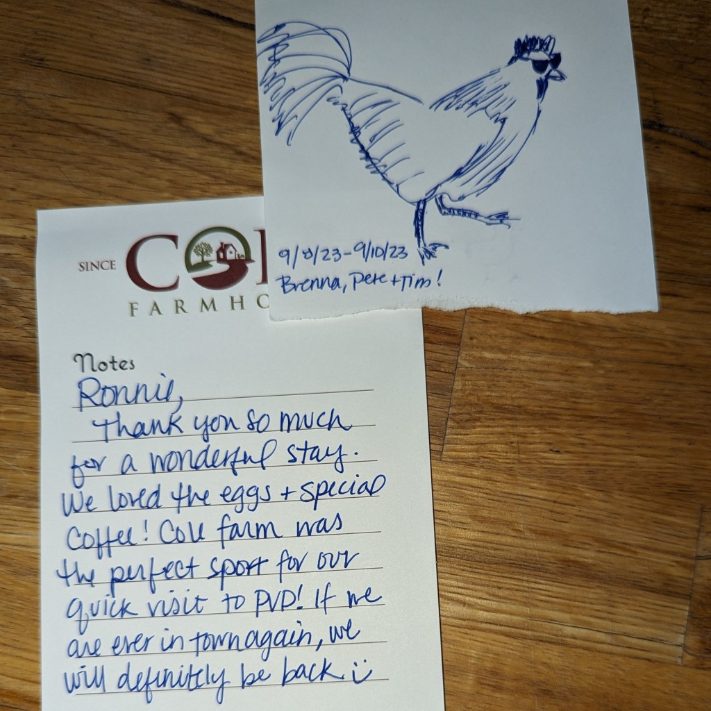 Thank you so much for a wonderful stay. We loved the eggs + special Coffee! Cole farm was the perfect sport for our quick visit to PVD! If we are ever in town again, we will definitely be back!