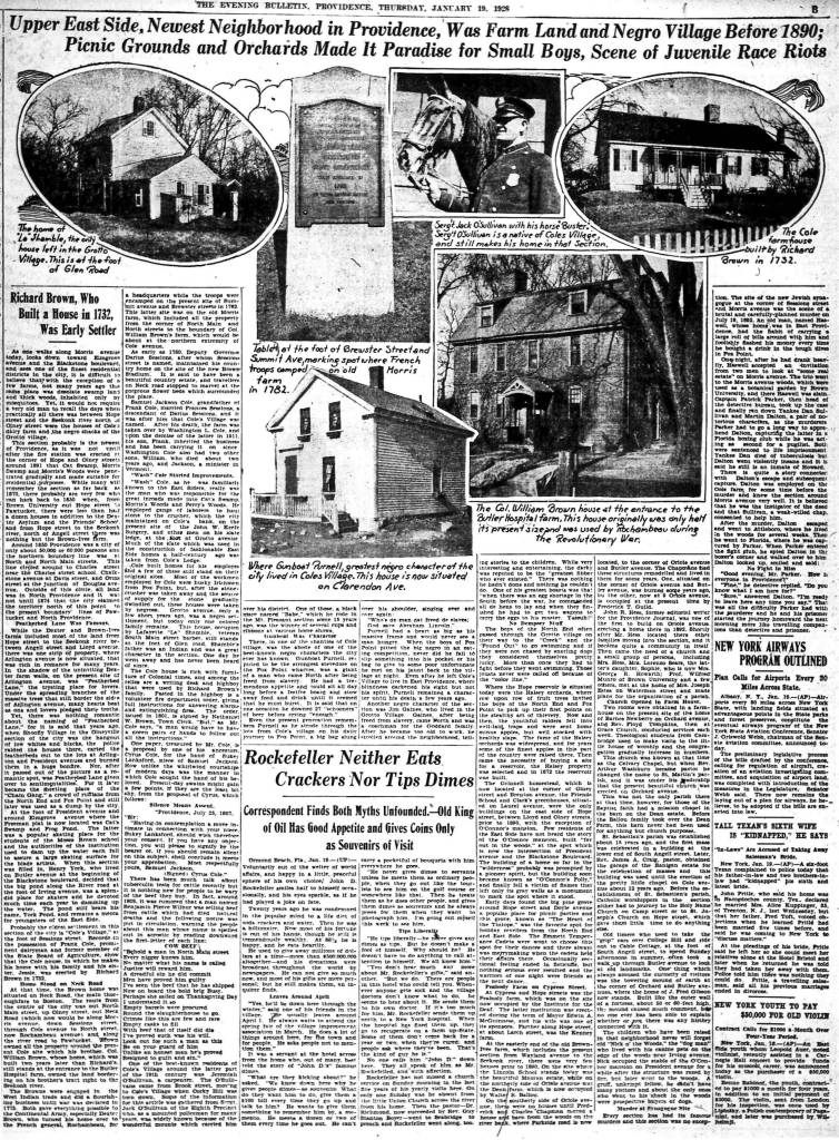 Purnell had heart as big as his massive frame and would never see a man hungry. When the boys of Fox Point pitted the big negro in an eating competition, never did he fall to slip something into his pocket, or his bag to give to some poor unfortunate he met on his Jaunt back to the village at night. Even after he left Cole’s Village to live in East Providence, where blindness darkened his right but not his spirit. Purnell remained character until his death a few years ago. Another negro character of the section was Jim Gaines, who lived in the Grotto Village. Gaines, after being freed from slavery came North and was A coachman for the Goddard family. After he became too old to work, he strolled around the neighbourhood, telling stories to the children. While very interesting and entertaining, the darky was reputed to be the greatest fibber who ever existed.” There was nothing he hadn’t done and nothing he couldn’t do. One of his greatest boasts was that when there was an egg shortage in the South before the war, he commanded all de hens to lay and when they finished, he had to get two wagons to carry the eggs to his master. Yassuh!”