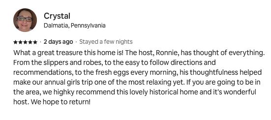 Crystal, Airbnb guest, Cole Farmhouse #USA1731, October 2024