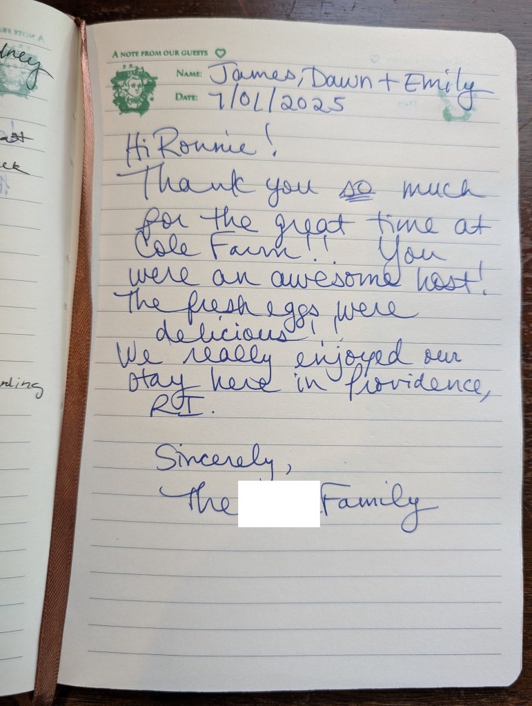 “Thank you so much for the great time at Cole Farm!! You were an awesome host! The fresh eggs were delicious We really enjoyed stay here in Providence, RI”