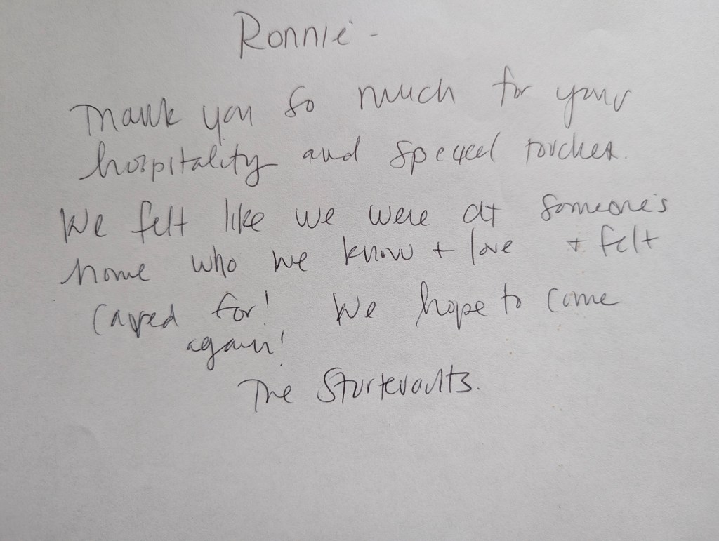 “Thank you so much for your hospitality and special touches. We felt like we were at someone’s home who we know + love + felt cared for! We hope to come again!”