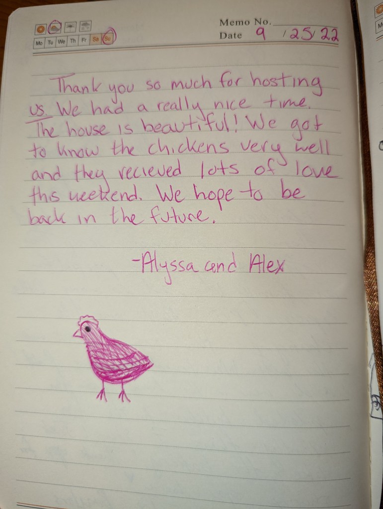 Thank you so much for hosting us. We had a really nice time. The house is beautiful! We got to know the chickens very well and they recieved lots of love this weekend. We hope to be back in the future.